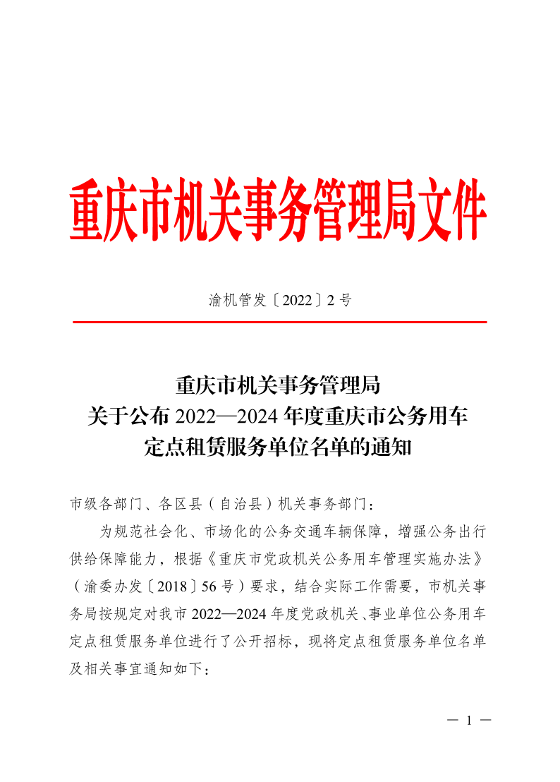 重慶市機關事務管理局關于公布2022—2024年度重慶市公務用車定點租賃服務單位名單的通知