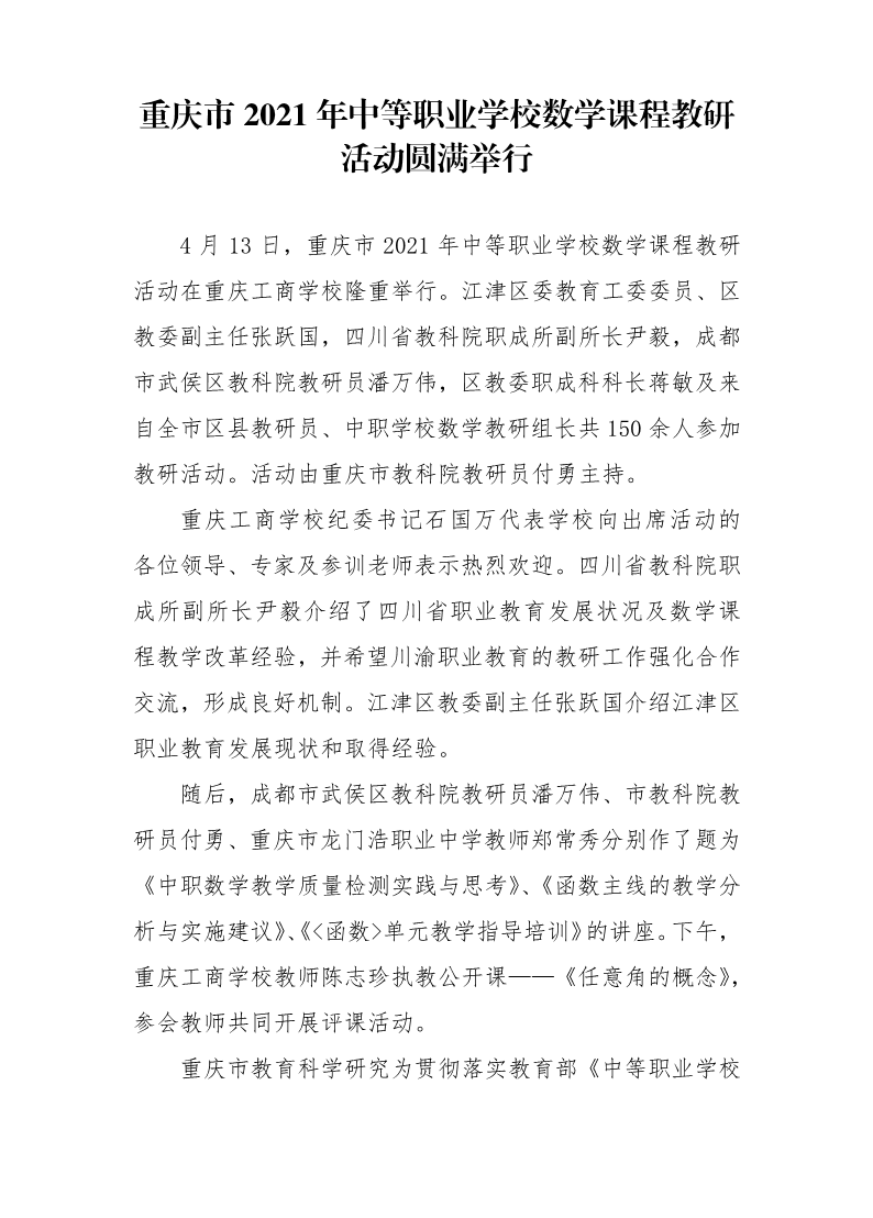 重慶市2021年中等職業學校數學課程教研活動圓滿舉行