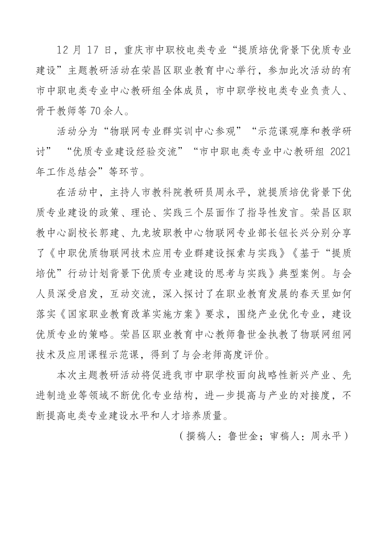聚焦提質(zhì)培優(yōu) 共商專業(yè)建設(shè) ——全市中職校電類專業(yè)主題教研活動(dòng)在榮昌區(qū)職教中心舉行 作者: 來源: 發(fā)布時(shí)間:2021年12月22日 點(diǎn)擊數(shù): 次 【字體:小 大】 分享到: 【打印正文】