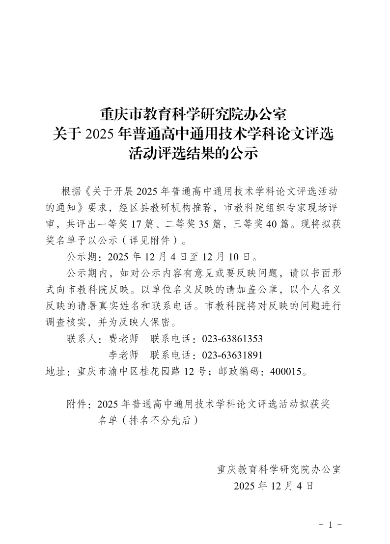 重慶市教育科學研究院辦公室關于2025年普通高中通用技術學科論文評選活動評選結果的公示